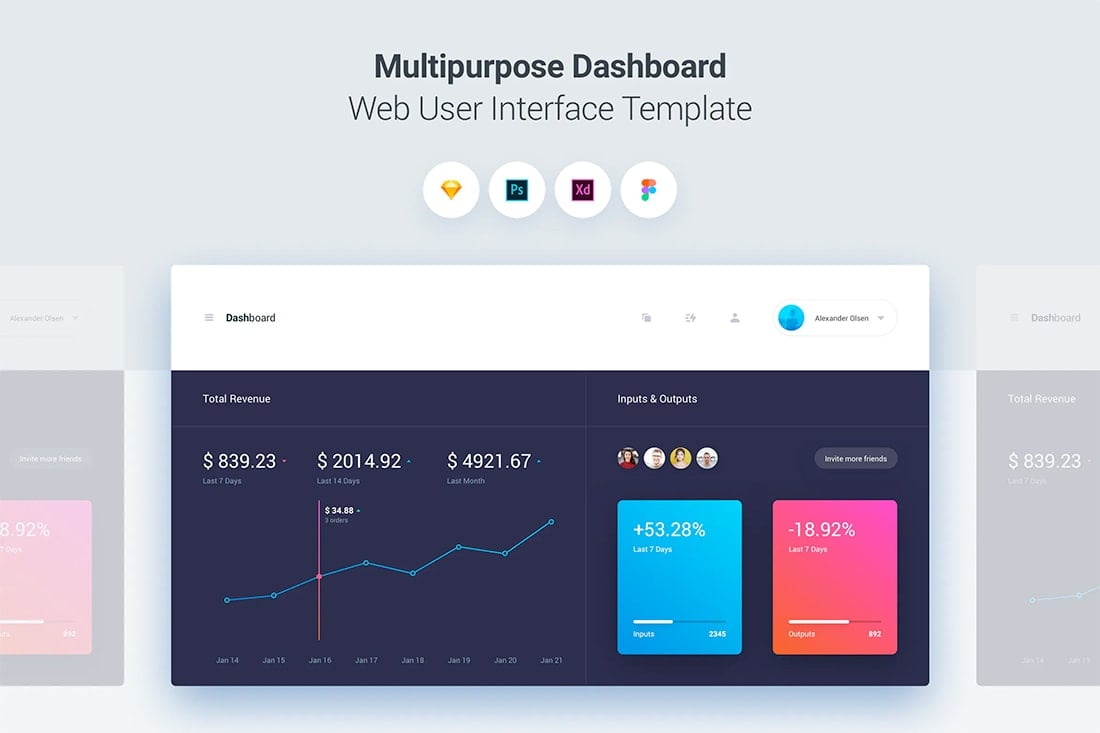 This Figma template for a multipurpose dashboard is stylish and includes a ton of components for customization. You can scale the elements to meet any need you might have.